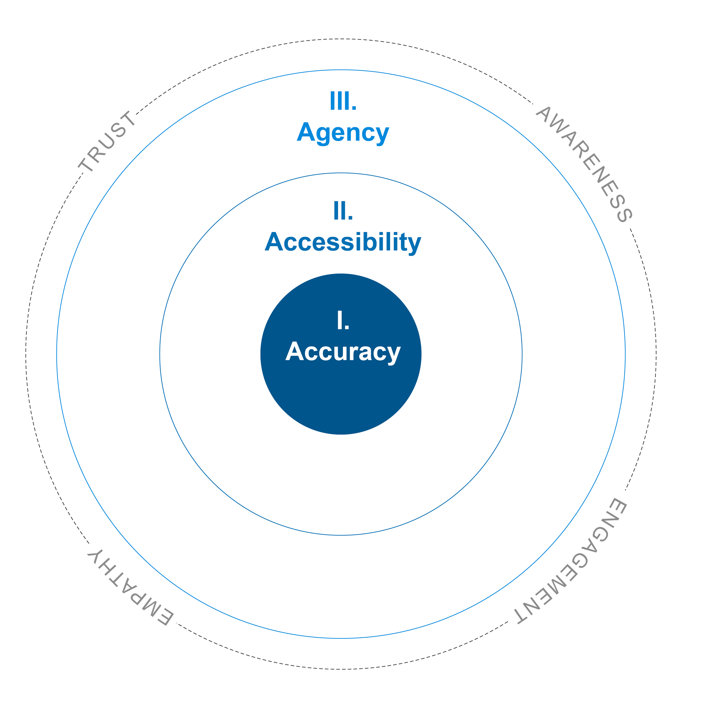 At the center of the framework are interconnected principles of Accuracy, Accessibility, and Agency. These are surrounded by an outer ring of trust, awareness, engagement, and empathy, the conditions I aim to cultivate in every project. Accuracy becomes the basis for trust; accessibility nurtures awareness and empathy; and agency transforms understanding into active engagement. Together, they guide my process from truth to understanding and from understanding to responsibility, allowing remembrance to function as an ethical, living practice.